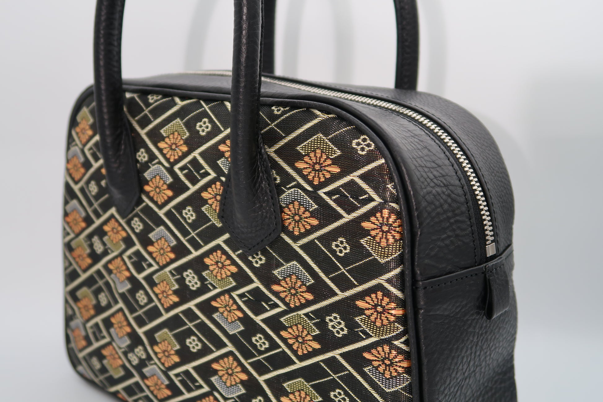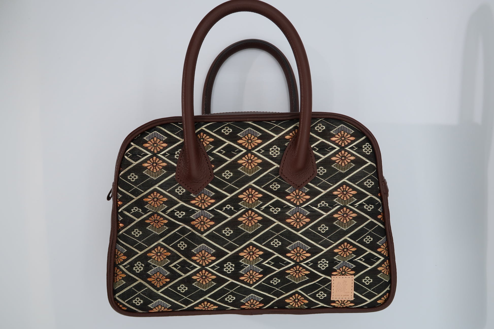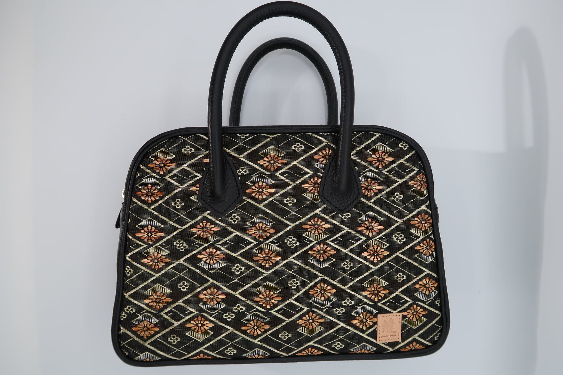畳に使用する縁(ヘリ)と革を用いたボストンバック。