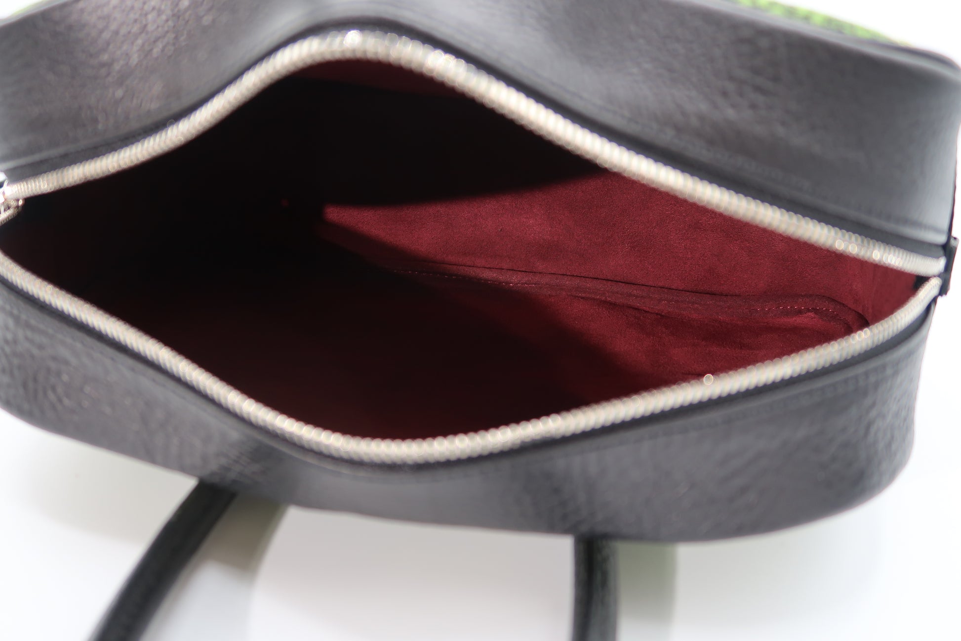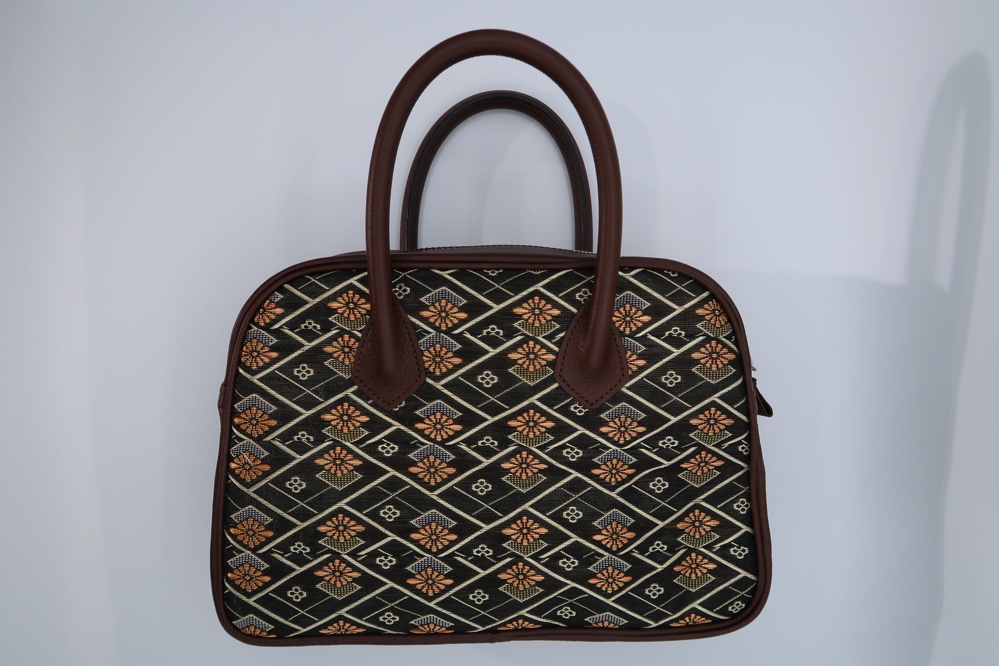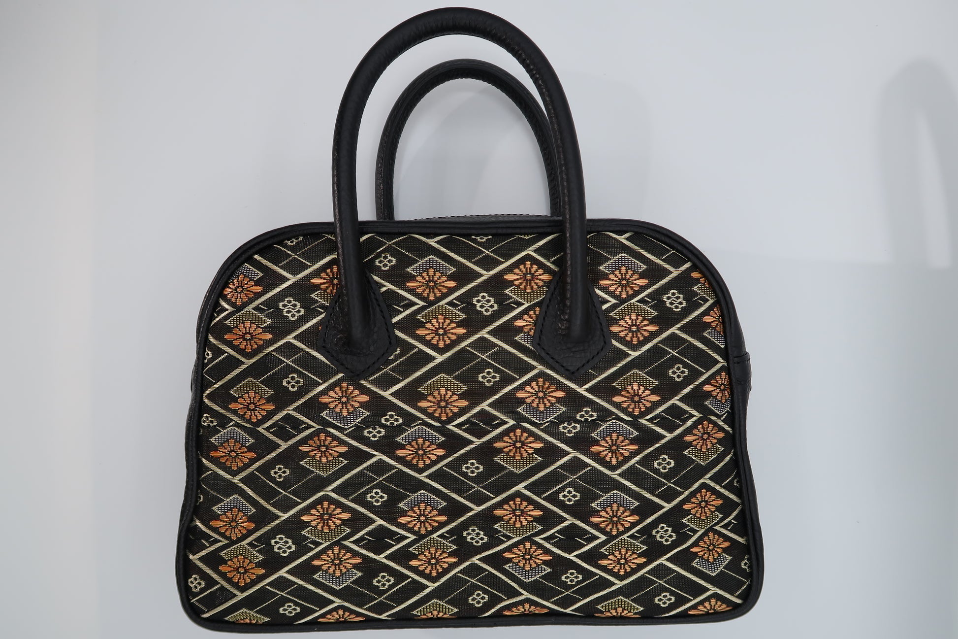 畳に使用する縁(ヘリ)と革を用いたボストンバック。
